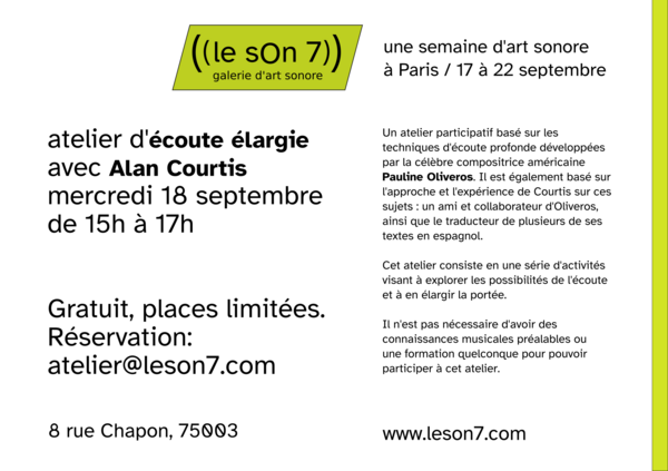 Le mercredi 18, de 15 à 17h, l'artiste Alan Courtis animera un atelier sur « l'écoute élargie », basé sur les techniques de l'écoute profonde développées par Pauline Oliveros dont il a été un ami et collaborateur, et sur l'approche de Courtis lui-même. Il s'agit d'une série d'exercices practiques visant à explorer les possibilités de l'écoute pour élargir les perceptions. Pour participer, écrivez à : atelier@leson7.com